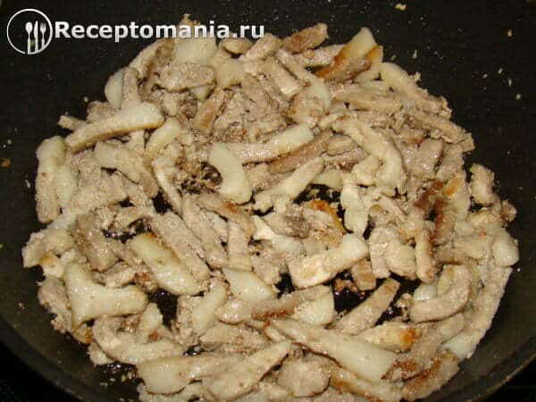 На хорошо разогретой сковороде с растительным маслом обжариваем свинину до золотистой корочки.