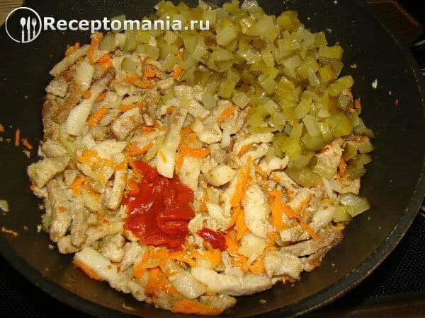 После добавляем морковь, натертую на крупной терке и лук нарезанный кубиками, жарим до полу готовности. Добавляем к мясу нарезанные кубиками огурцы и томатную пасту.