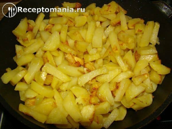 На хорошо разогретой сковороде с растительным маслом обжариваем картофель нарезанный брусочками до готовности.