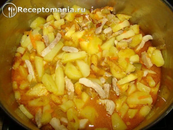 Перемешиваем, добавляем воду и тушим 15 минут.
