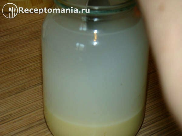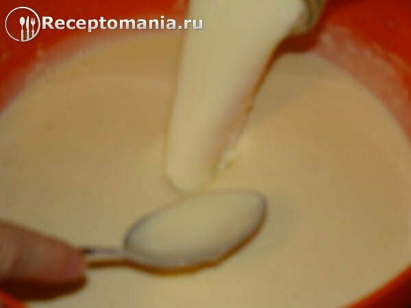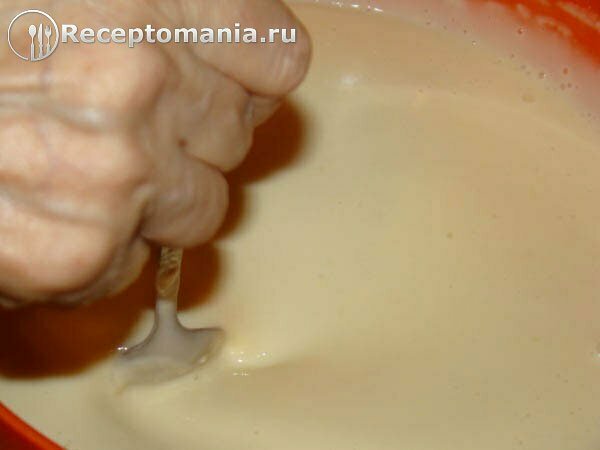 Остатки воды со сгущенным молоком приблизительно делим на четыре части. Вливаем первую порцию, размешиваем и так четыре раза.
