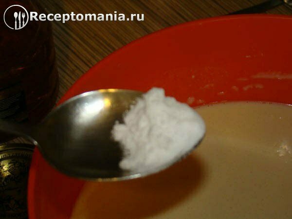 Добавляем гашеную соду. Для этого берем столовую ложку, насыпаем в нее 1 ч.л. соды и наливаем яблочного уксуса, делайте это над раковиной, чтобы случайно не перелить уксус в тесто.