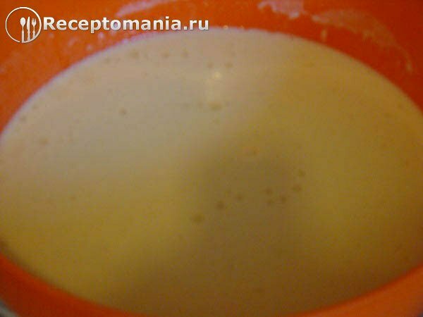 Размешиваем и переливаем половину в посуду, в которой будем готовить тесто для блинов. Остальную половину оставляем для дальнейшего замешивания теста.