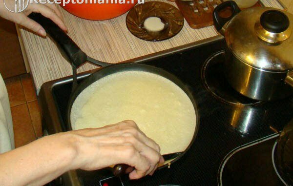 Печем блины на самом сильном огне. В половник наливаем тесто и выливаем на блинницу, так чтобы тесто растеклось ровным слоем. Количество теста зависит от размера блинницы.