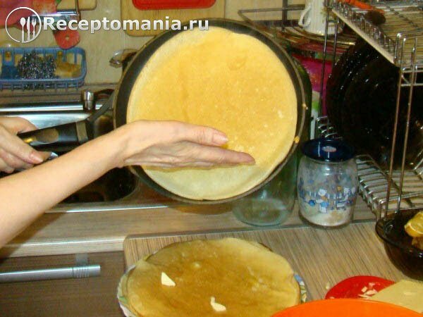 Снимаем блин, опрокидывая на ладошку, делайте это быстро. Если боитесь обжечься, воспользуйтесь лопаткой.