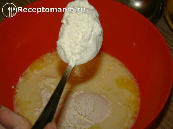 В получившуюся смесь кладем 7 ст.л. муки с горкой как указано на фото.