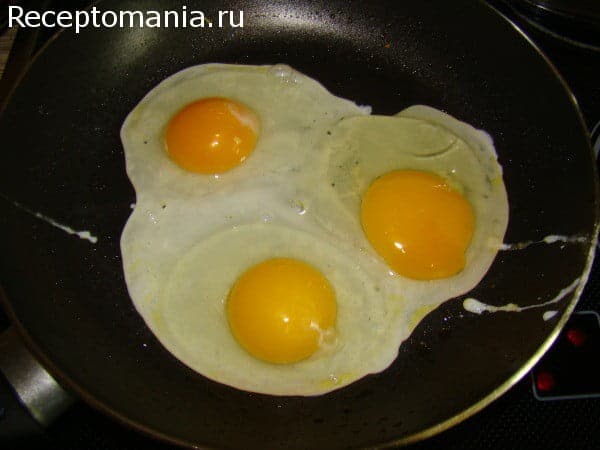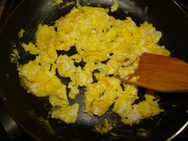 Далее разбиваем яйца и выливаем на разогретую сковороду, перемешиваем и ждем пока яйца полностью свернуться.