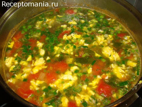 Перекладываем яйца в борщ, добавляем зелень, солим и варим 5 минут.