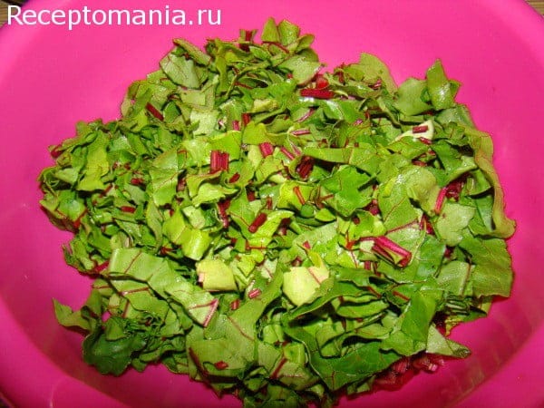 Моем ботву свеклы и нарезаем вместе со стеблями.