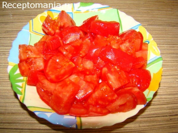 Нарезаем помидоры кубиками, предварительно очищенные от кожуры. Для того чтобы кожура хорошо очистилась, опускаем помидоры в кипяток на 2-3 минуты.
