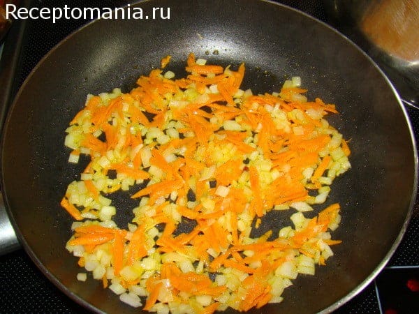 Делаем зажарку. На крупной терке измельчаем морковь и нарезаем лук небольшими кубиками, немного обжариваем на растительном масле.