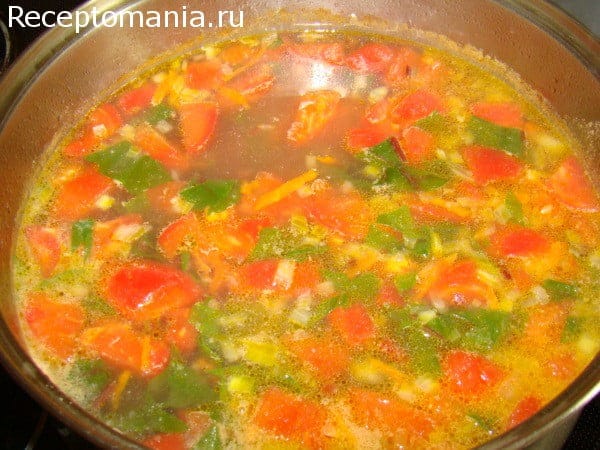Добавляем в кастрюлю с мясом и картофелем ботву свеклы, помидоры и зажарку. Варим 10-15 минут.