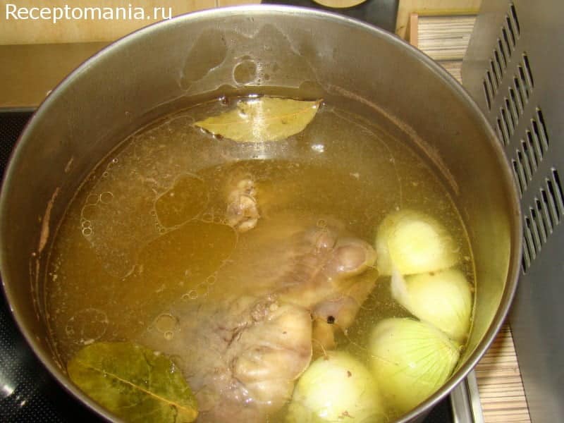 За 20 минут до окончания приготовления добавляем одну большую луковицу, разрезанную на четыре части, две лаврушки, перец черный горошком штучек десять, соль.