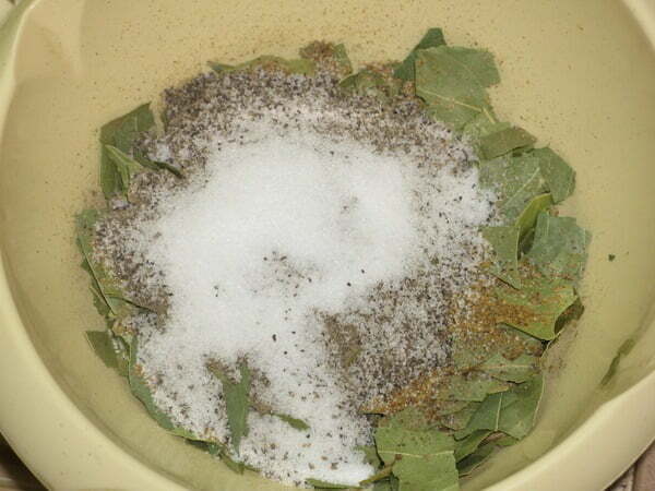 Смешиваем черный и красный перец, красного положить чуть меньше. Добавляем лаврушку и соль.