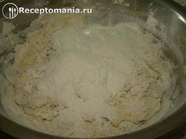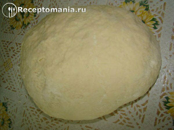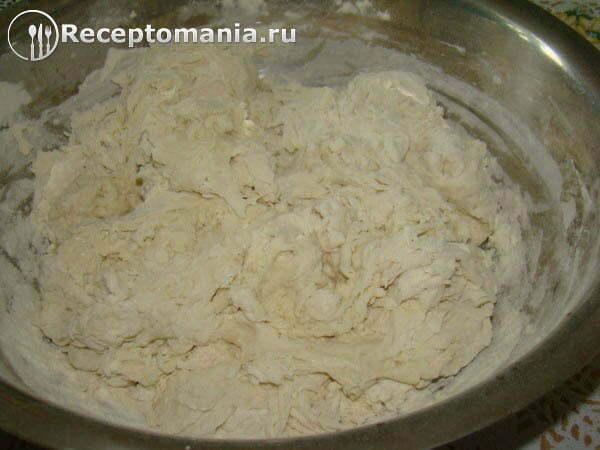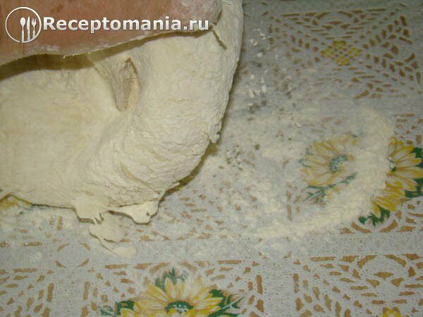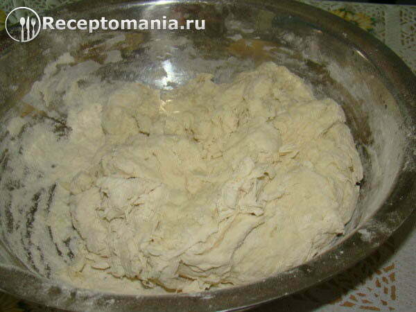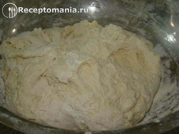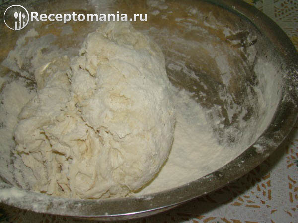 Выкладываем тесто на стол посыпанный мукой и продолжаем вымешивать. Тесто должно стать эластичным и не прилипать к рукам.