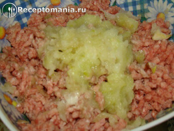 Накрываем тесто полотенцем и оставляем на 15 минут. В это время приготовим начинку. Для этого в фарш из говядины и свинины добавим лук. Лук можно измельчить двумя способами, а именно натереть на крупной терке или нарезать небольшими кубиками. Солим, перчим. Все хорошо перемешиваем.