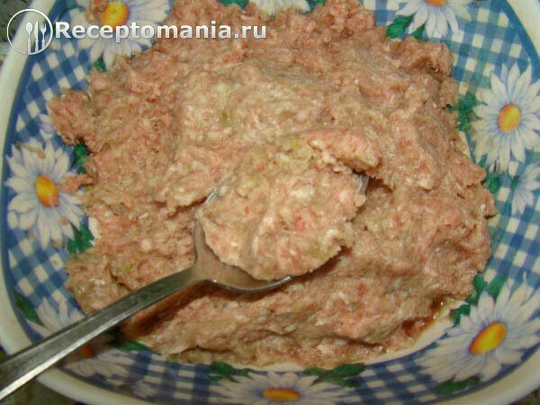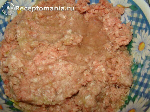 Наливаем в фарш ¼ стакана воды, размешиваем.