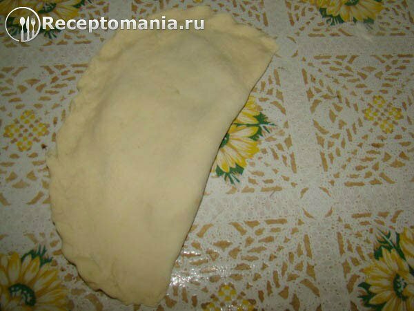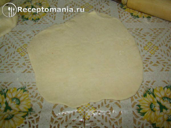 Скалкой раскатываем тесто, чтобы получился тонкий круг.