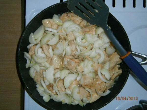 Лук берем среднего размера, нарезаем полукольцами и добавляем в курицу, обжариваем до полуготовности лука.