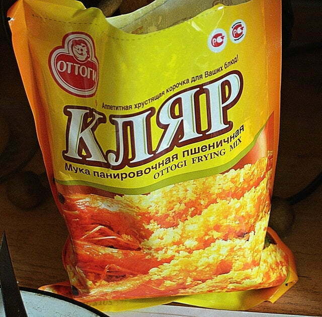 Берем кляр, разводим, как указано на упаковке в одной тарелке и в другую просто насыпаем сухой. В сухом виде используем для того, чтобы жидкий кляр не стекал, и образовалась корочка.