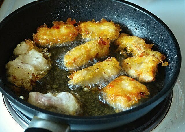Сначала обмакнуть в жидкий кляр потом в сухой и на разогретую сковороду с маслом.