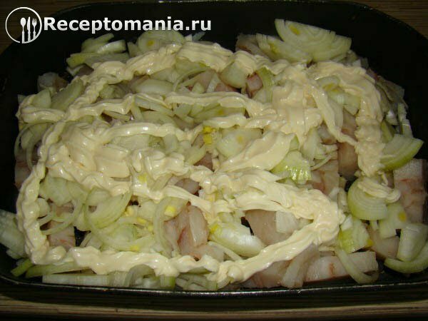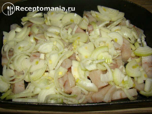 Нарезаем лук полукольцами, чем больше лука, тем сочнее получиться рыба.