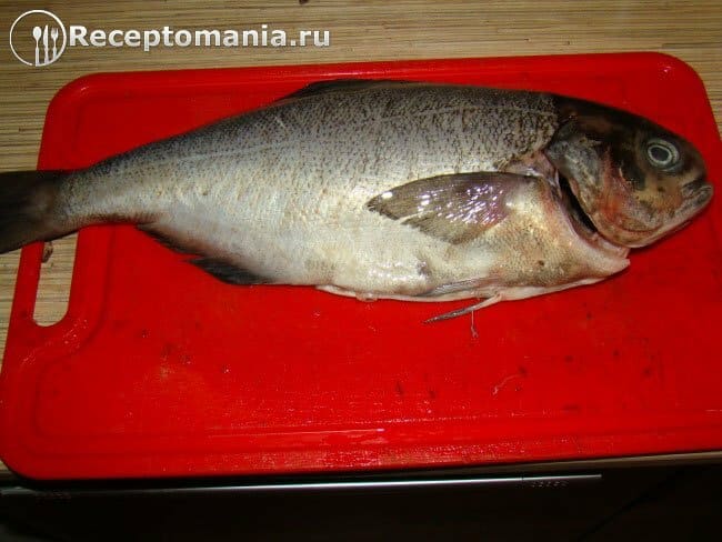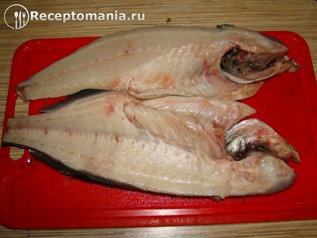 Очищаем рыбу от внутренностей и чешуи, разрезаем пополам.