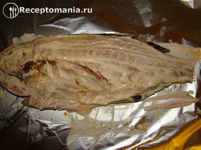 Равномерно обмазываем рыбу сметаной и заворачиваем в фольгу.