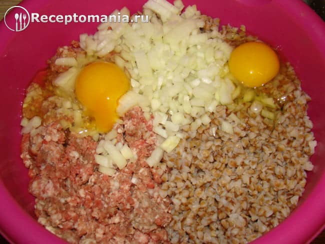 Отвариваем гречневую крупу 1:2. В кипящую воду насыпаем крупу, не перемешивая, даем закипеть и оставляем на медленном огне до полного выпаривания воды. Готовую гречневую крупу выкладываем к фаршу, добавляем яйца, нарезанный кубиками лук и соль.
