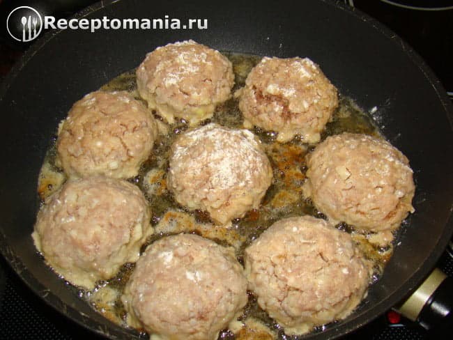 Формируем котлету из фарша и обваливаем в муке. Выкладываем на разогретую сковороду с растительным маслом и обжариваем на среднем огне с двух сторон до готовности.