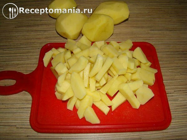 Чистим картофель и нарезаем соломкой, перекладываем в закипевшую воду.