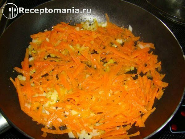 Предварительно на растительном масле обжариваем морковь, измельченную на крупной терке и лук, нарезанный кубиками лук.