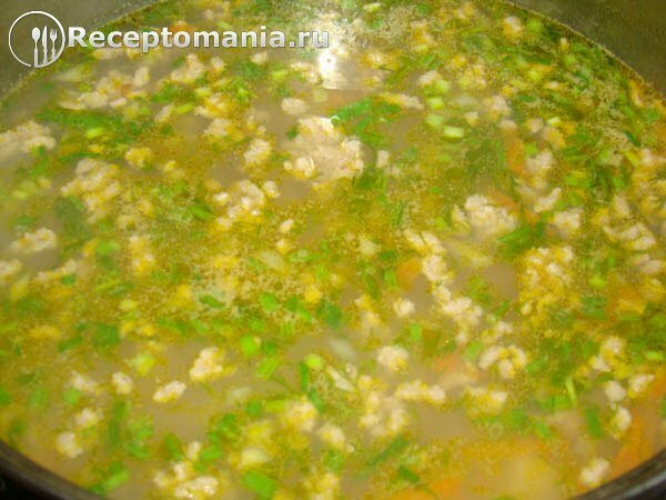 Варим 10 минут, добавляем зелень, солим. Снимаем с плиты.
