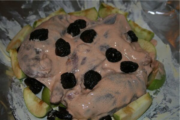 Отрезаем фольгу, смазываем ее маслом, выкладываем яблоки нарезанные дольками и чернослив. Сверху кладем гуся. Остатки маринада выливаем на мясо. Вокруг и сверху обкладываем оставшимися яблоками и черносливом.
