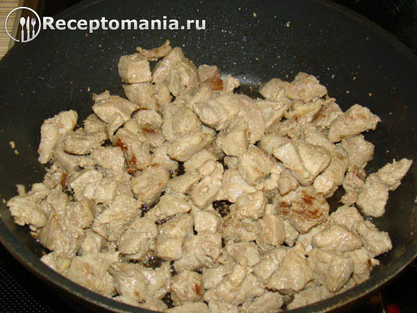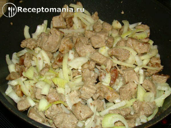 Выкладываем на хорошо разогретую сковороду с растительным маслом и немного обжариваем. Если выделиться много сока, слейте его в отдельную посуду, будем его использовать чуть позже.