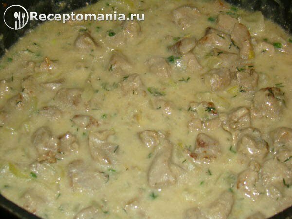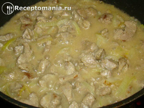 Филе индейки – 1 кг. Лук – 2 шт. Мука – 1 ст.л Вода (кипяток) -500 мл. Майонез – 2 ст.л. Чеснок -2 зубчика Зелень СольПриготовление: