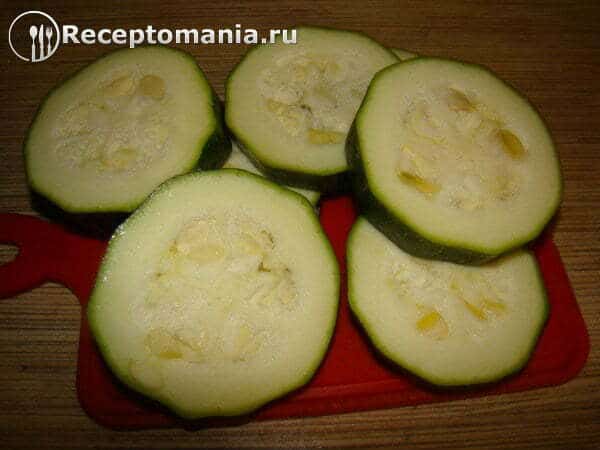 Берем кабачки и нарезаем кольцами толщиной 1,5 – 2 см.