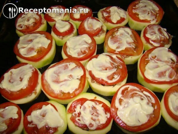 Сверху кладем помидоры, нарезанные кольцами, и смазываем майонезом.