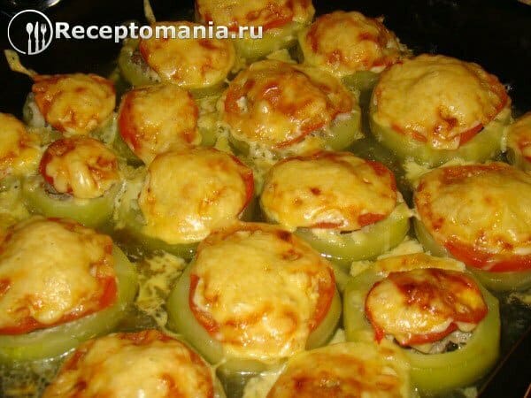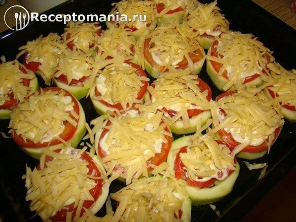 Измельчаем на крупной терке сыр и посыпаем каждый нафаршированный кабачок.