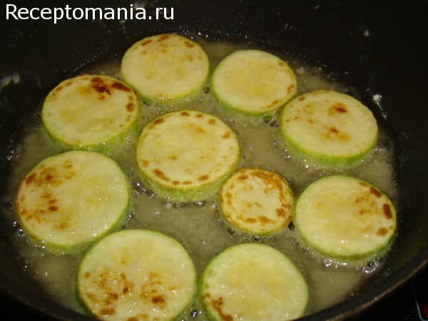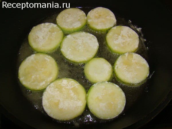 Для того чтобы кабачки сохранили форму и сочность, обваляем их в муке и обжарим с двух сторон на растительном масле на сильном огне до золотистого цвета.
