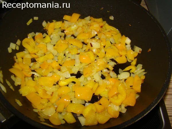 Нарезаем перец и лук кубиками, обжариваем на растительном масле на среднем огне до полуготовности. Если вы любите перец по крупнее, тогда сначала немного обжарьте его, а после добавляйте лук, также готовим до полуготовности.