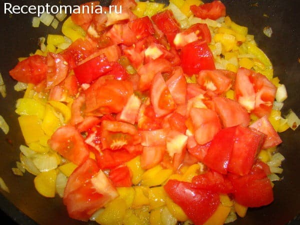 Добавляем помидоры нарезанные кубиками и очищенные от кожуры. Для того чтобы кожура хорошо очистилась, опускаем помидоры на 2-3 минуты в кипяток. Тушим 5 минут.