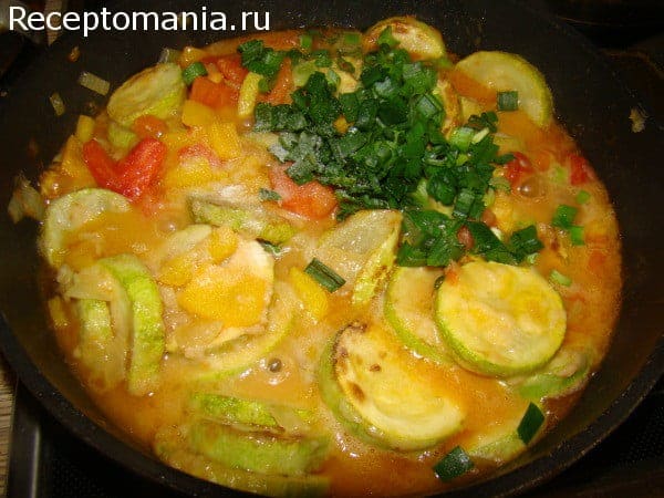 Тушим на среднем огне около 20 минут под закрытой крышкой периодически помешивая. В конце приготовления добавляем зеленый лук и соль.