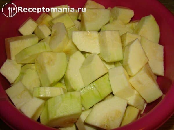 Если кожура жесткая, очищаем кабачок, нарезаем крупными кольцами, после разрезам на четыре части.