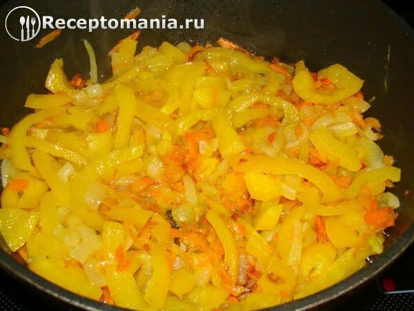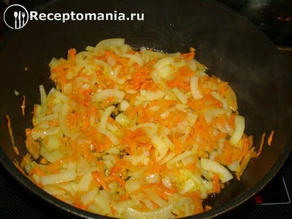 Измельчаем морковь на крупной терке и нарезаем лук полукольцами, обжариваем овощи на растительном масле до полуготовности.