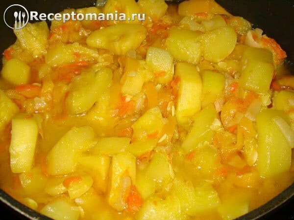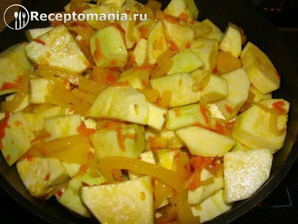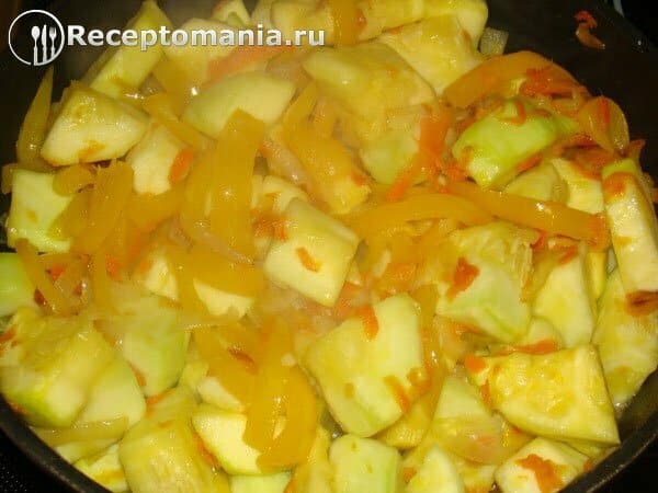 Перекладываем кабачки, перемешиваем, накрываем крышкой и тушим 30 минут периодически помешивая. В конце приготовления солим по вкусу.
