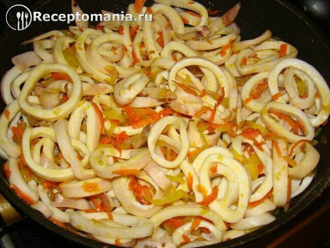 Кольца кальмара перекладываем в сковороду, накрываем крышкой и снимаем с огня.