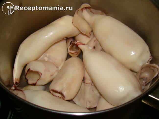 Очищаем кальмар от шкуры и опускаем в кастрюлю с кипящей подсоленной водой. Не закрывая кастрюлю крышкой, ждем пока он закипит. Как только кальмар стал кипеть, снимаем с огня и сливаем воду.
