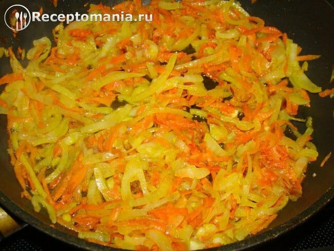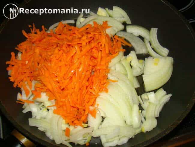 Измельчаем морковь на крупной терке и нарезаем полукольцами лук.