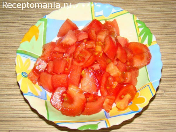 После добавляем помидоры, предварительно очищенные от кожуры. Варим 5 минут. Чтобы кожура хорошо очистилась, предварительно опустите помидоры в кипяток на 2-3 минуты.